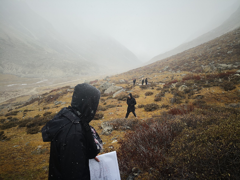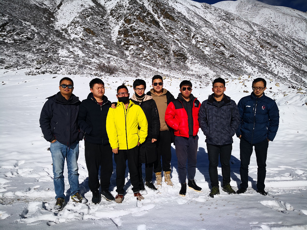 深秋的西藏,海拔4000米左右的山上已是白雪皑皑,寒风凛冽。10月9日上午,项目组开始该项目的外业踏勘,由于有12公里道路十分狭窄,车辆无法通行,只能徒步进行踏勘。崎岖不平、冰雪覆盖的羊肠小道对每一位踏勘人员的体力和意志都是严峻考验。踏勘过程中,大家互相帮助,团结向前,克服种种困难,圆满完成了当天的工作。
